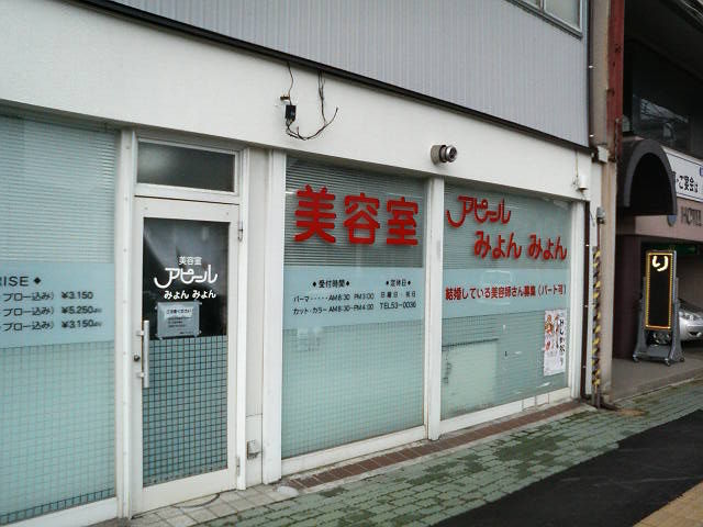 字が小さいですが「美容室・ヘアーメイクみょんみょん」の文字が。